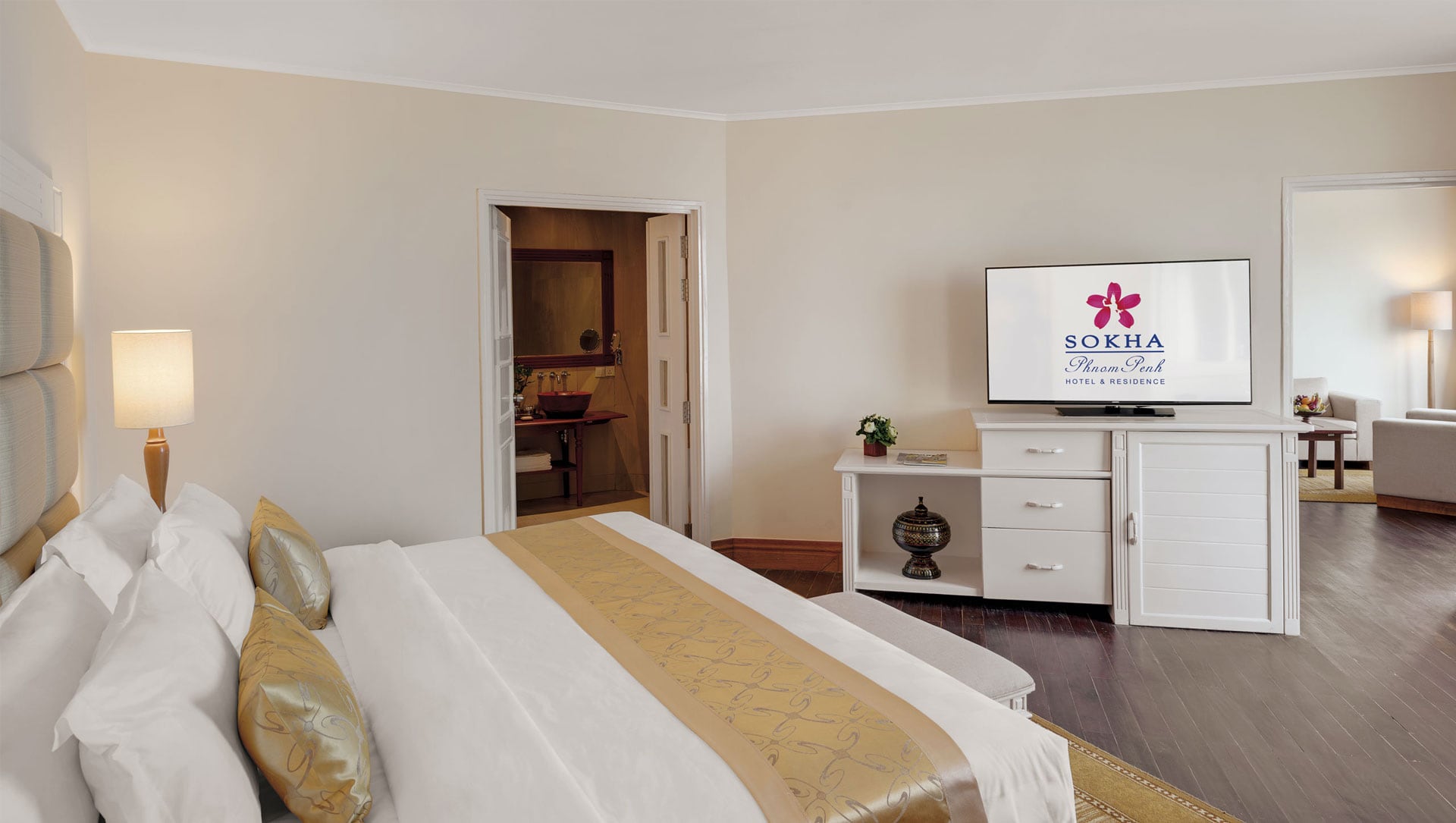 A spacious 71 sqm/764 sqf two-room suite with separate living/dining room and bedroom. The room features with breathtaking view of spectacular Chaktomuk River, the confluence of the Great Mekong, Bassac and Tonle Sap Rivers and peaceful greenery of Phnom Penh city.