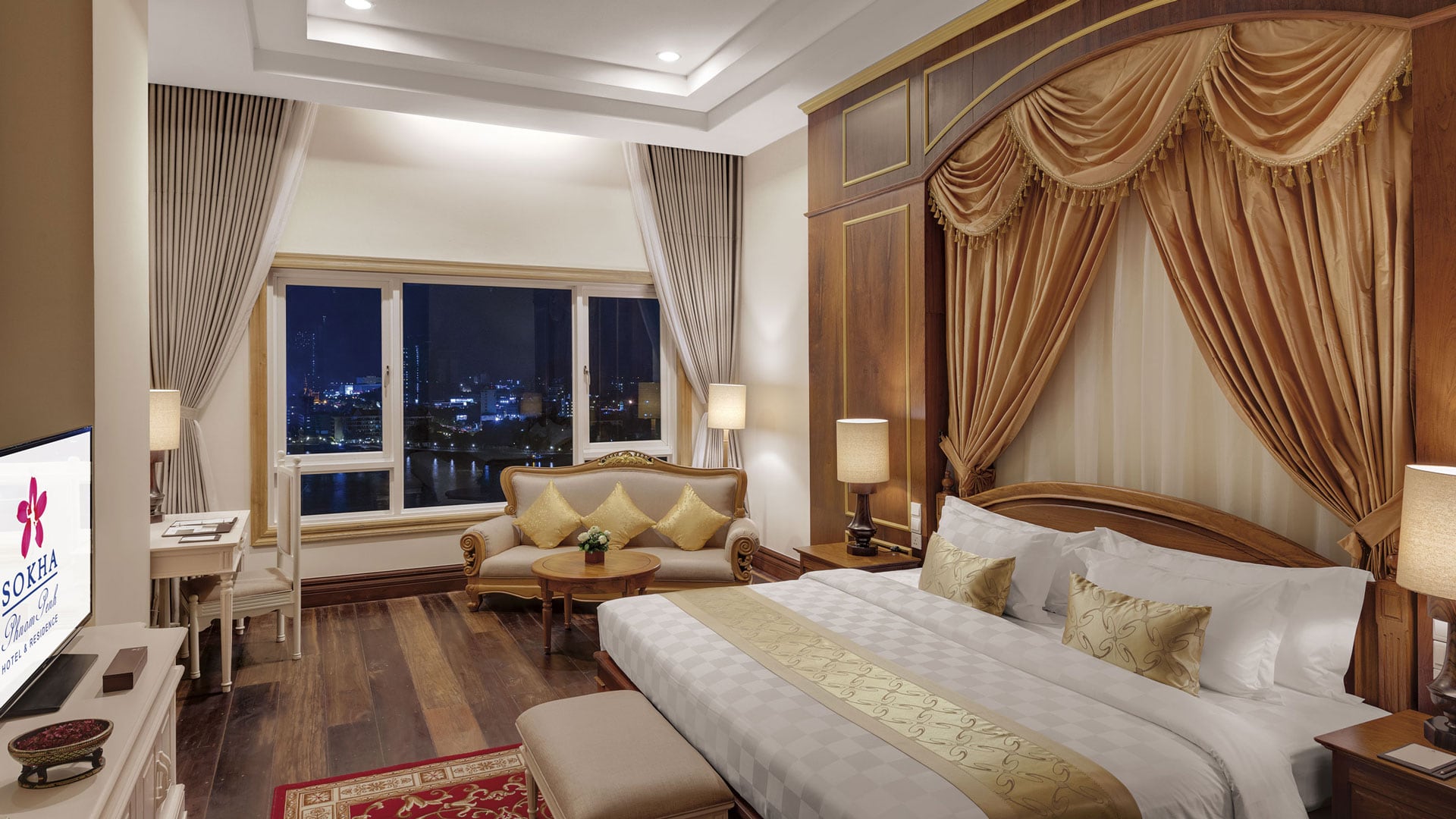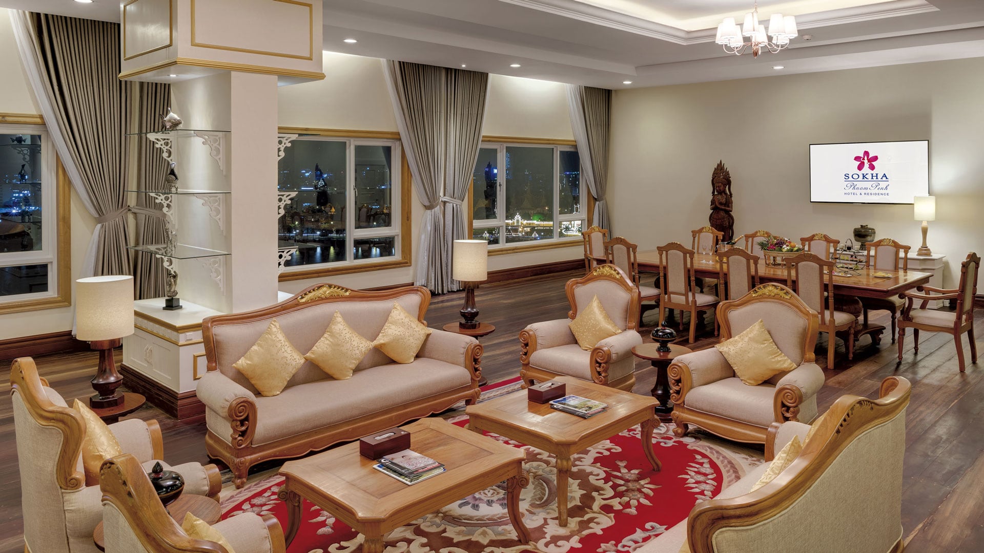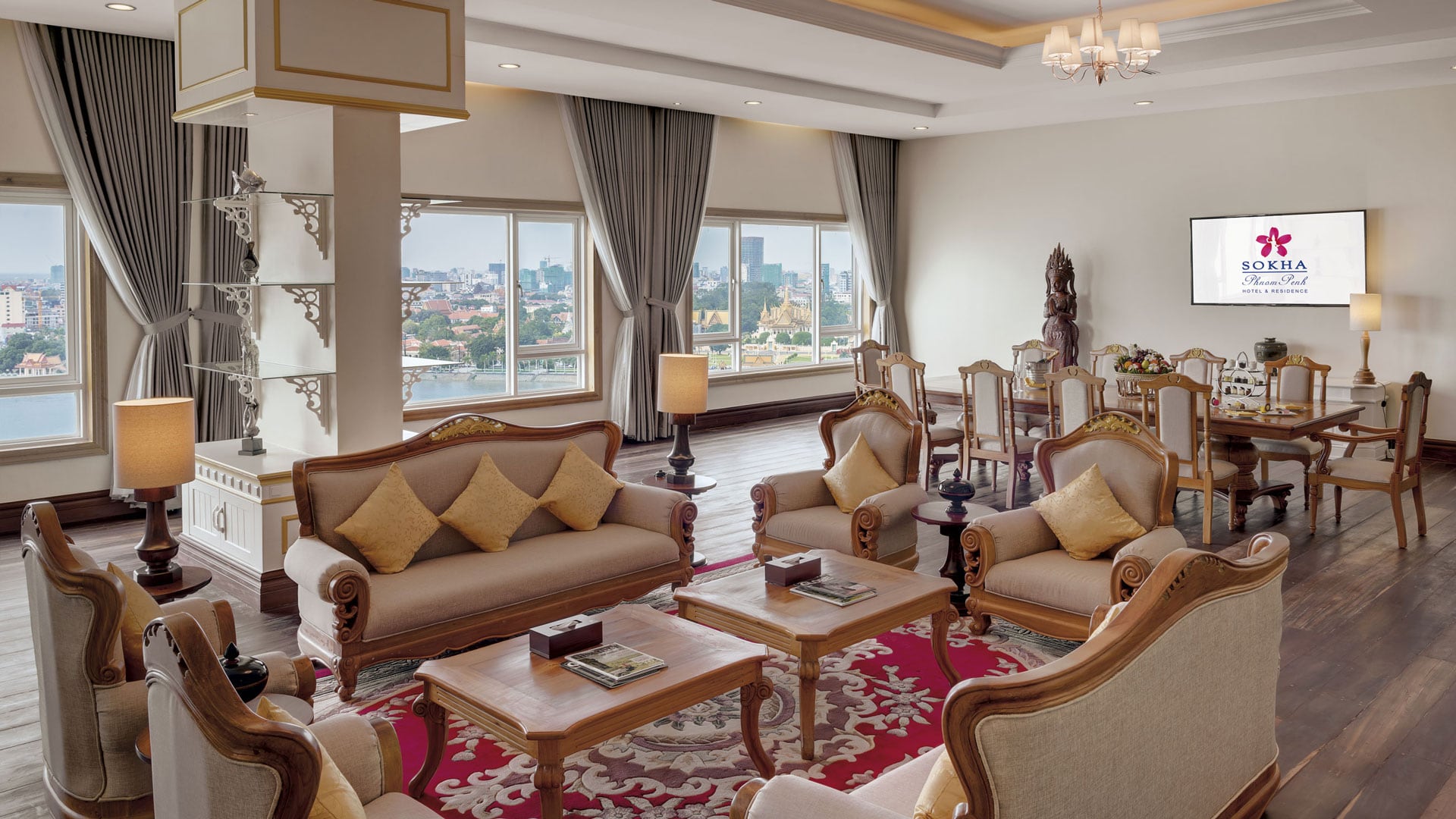 With harmonious blend of comfort and extravagant elegance, the Royal Sokha Suite presents a true sense of luxury stay. The suite features a wide sweeping view of serene rural greenery, breathtaking panoramic views of Phnom Penh, the Great Mekong and Tonle Sap Rivers from the upper floor and offer exclusive benefits such as access to the Mohori Lounge with daily happy hour, providing complimentary cocktails and canapés and a private breakfast facility.
